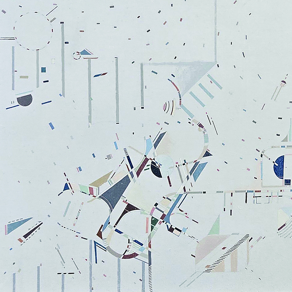 90 x 90 x 3.5 cм холст / масло Абстрактная геометрическая композиция, 2023г. Геометрическая абстрактная композиция «Разгон» - попытка уловить все аспекты спортивной гонки: скорость, движение, желание быть первым. Это ощущение передается через конкретные визуальные элементы. Например, шашечные фигуры - это отсылка к пит-стопам Формулы-1. На картине присутствует явные фигуративные элементы, вроде фигуры велосипедиста, который разгоняется на линии, стремящейся наверх. Движение и динамику картине также придают цветовые акценты, в виде ярких фигур, вкрапленных в общую композицию.