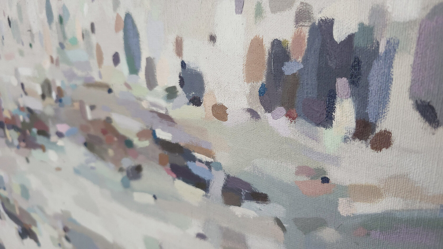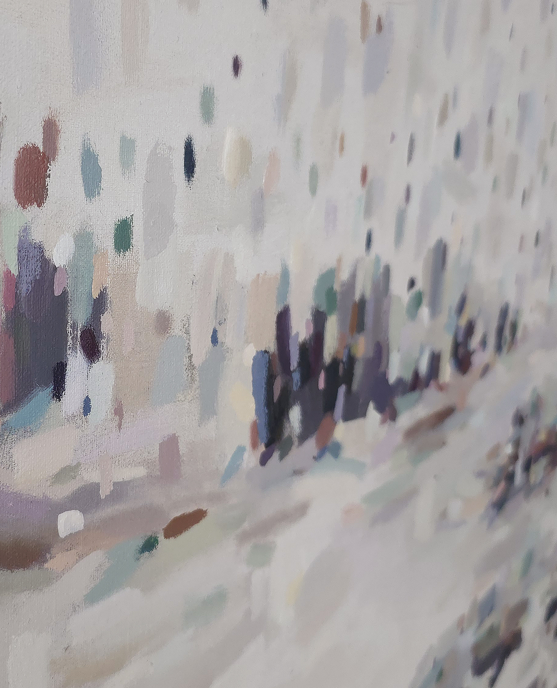 130 х 210 x 3.5 см холст / масло Абстрактный городской пейзаж, мозаичная многоцветная композиция, вид на город сквозь намокшее от дождя окно создает как будто калейдоскоп из расплывающихся форм и цветов. Картина написана на льняном холсте, на галерейном подрамнике, подписана автором с фронтальной и обратной стороны холста, крепеж в комплекте.