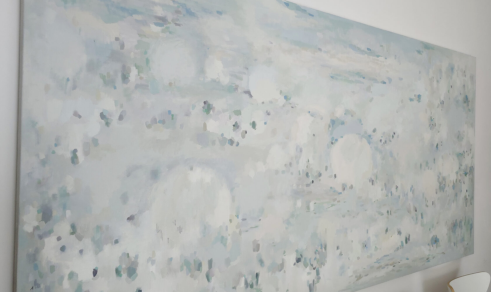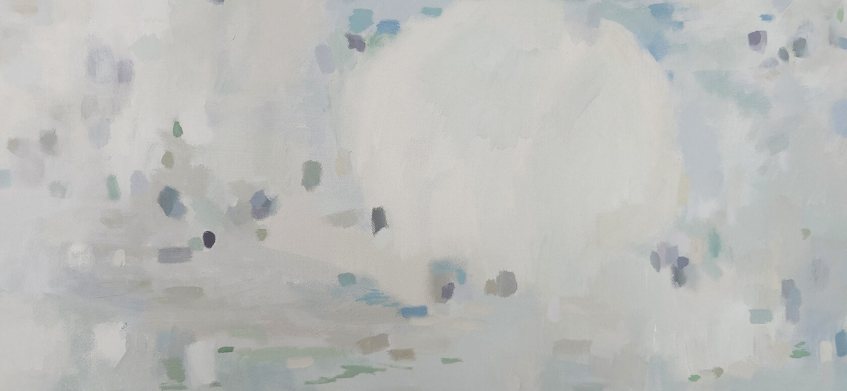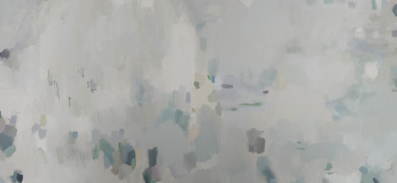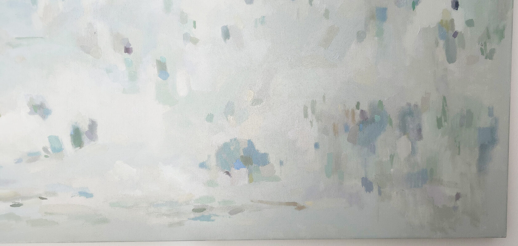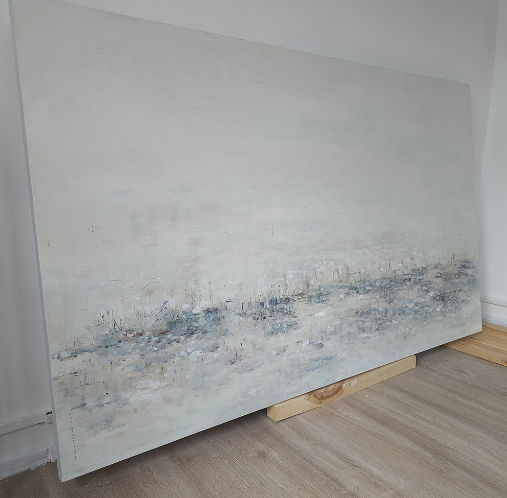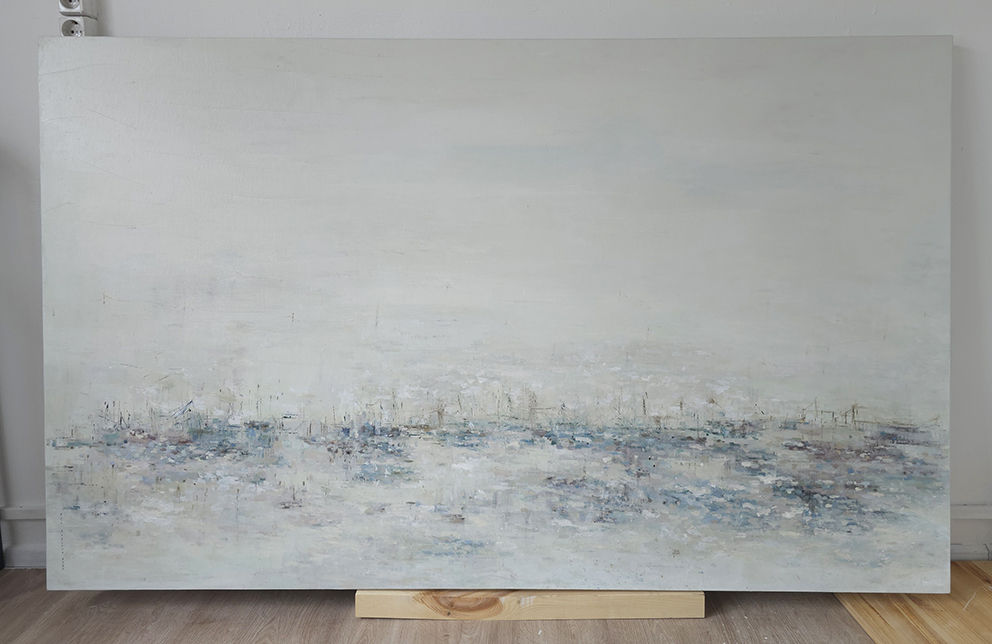120 х 180 x 3.5 см холст / масло Абстрактный пейзаж с видом на пруд, прохладное утро, тишина, еле колышутся листья деревьев. Работа выполнена на галерейном подрамнике толщиной 3.5 см, на 100% льняном холсте. 2024 г. Подписана автором с фронтальной и обратной стороны холста.
