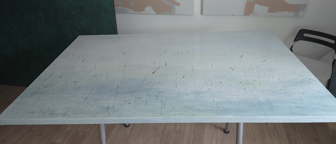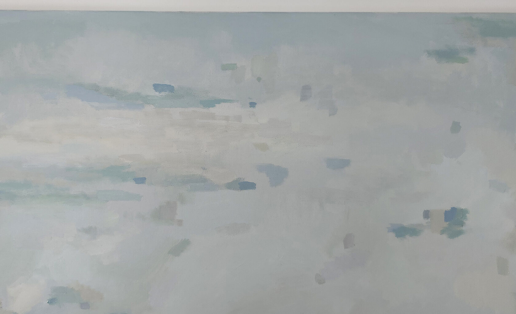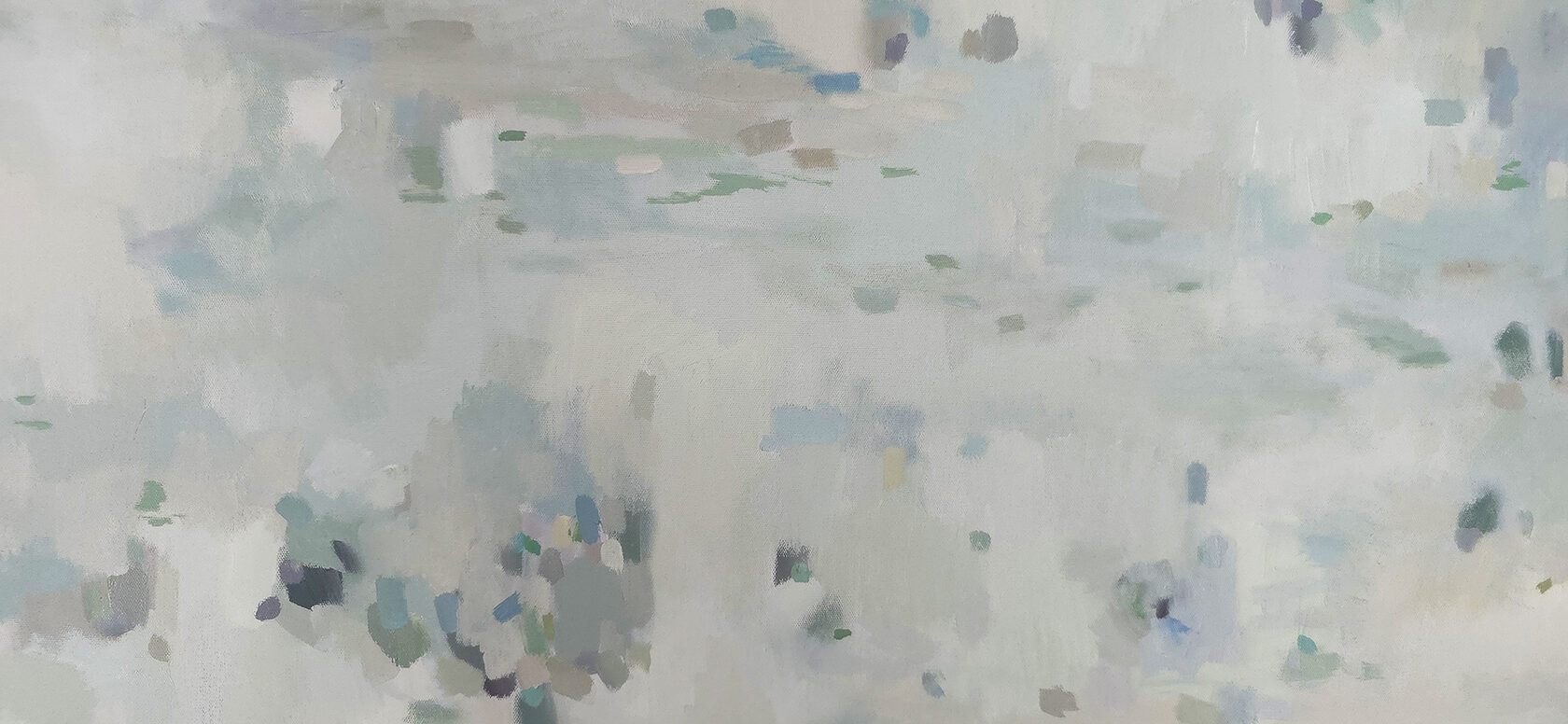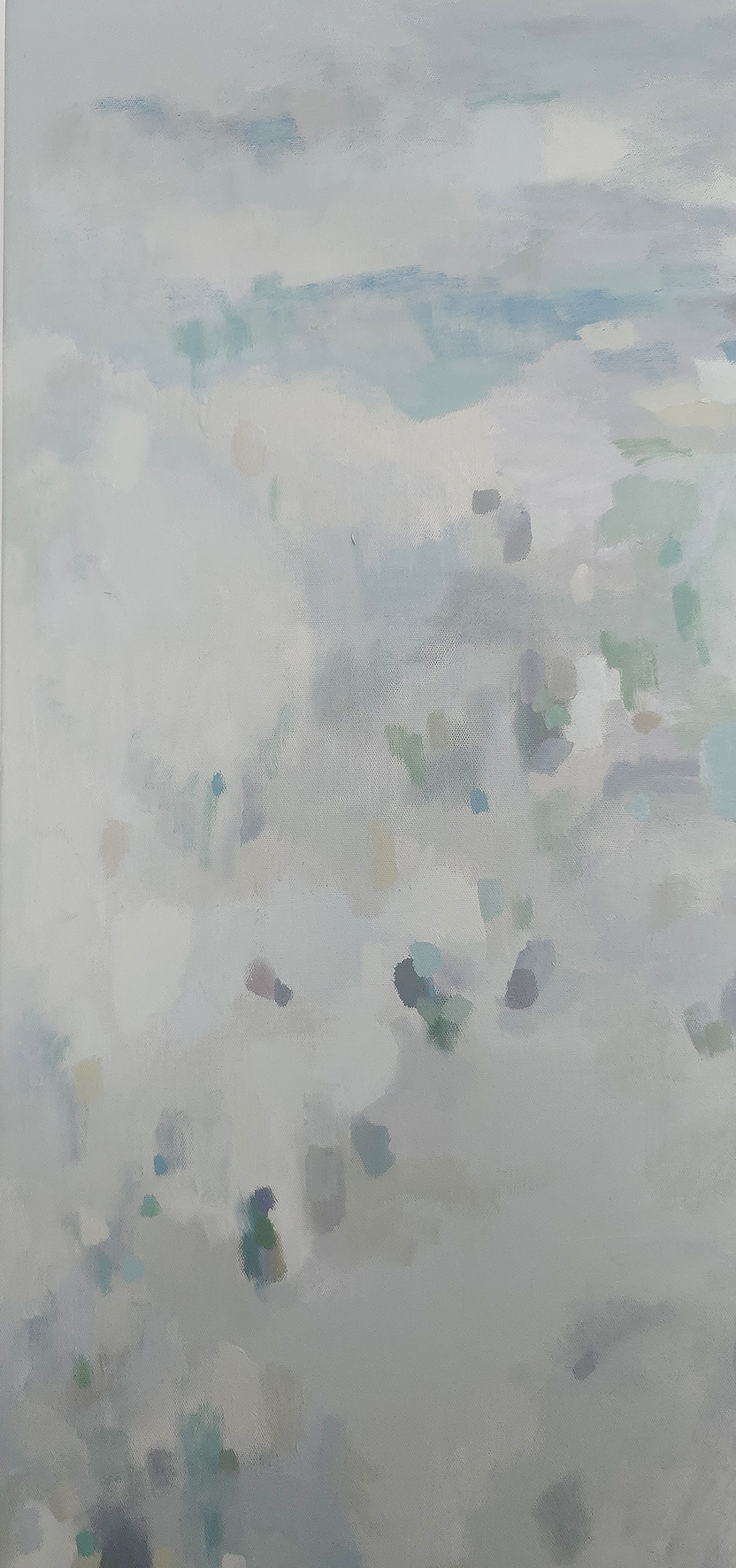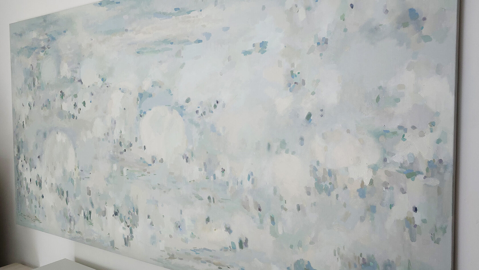 120 х 180 x 3.5 см холст / масло Абстрактный пейзаж с видом на пруд, прохладное утро, тишина, еле колышутся листья деревьев. Работа выполнена на галерейном подрамнике толщиной 3.5 см, на 100% льняном холсте. 2024 г. Подписана автором с фронтальной и обратной стороны холста.