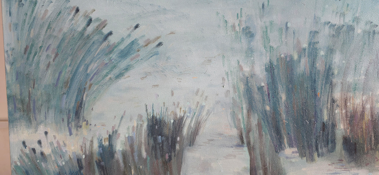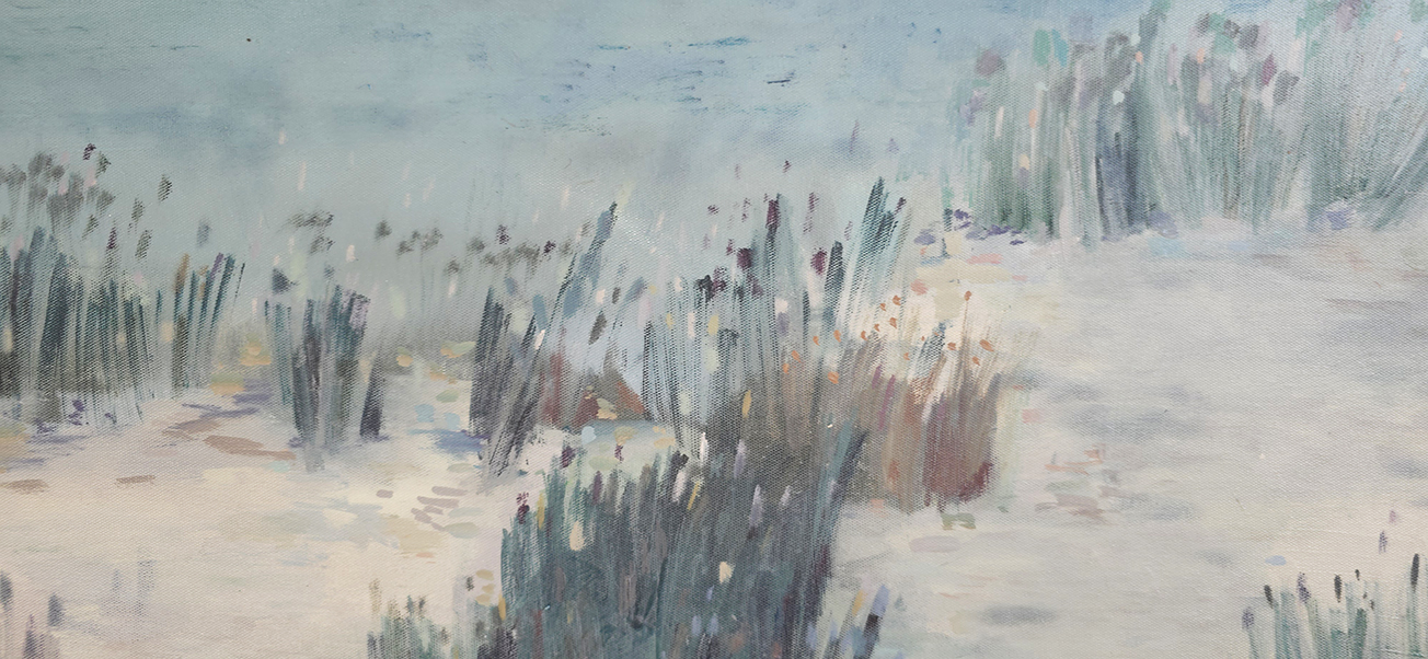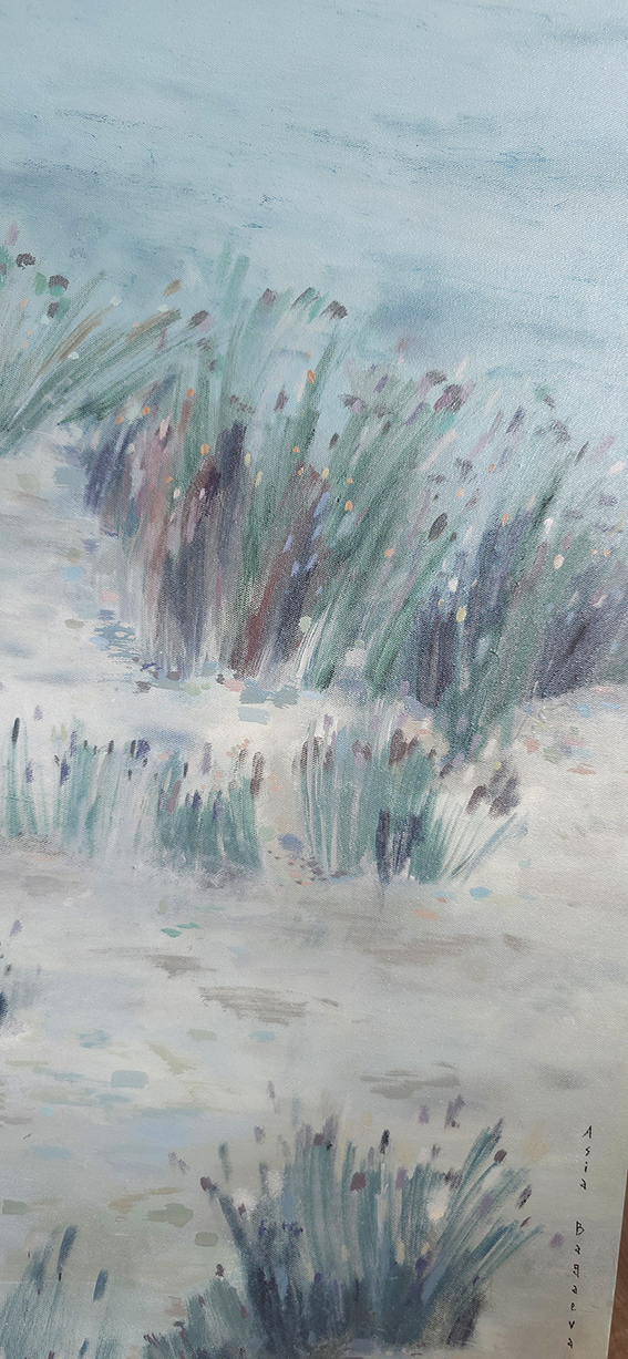 110 х 180 x 3.5 см холст / масло Абстрактный пейзаж , вид на колышущиеся веточки камыша и трав на фоне утренней реки. Работа выполнена на льняном холсте, на галерейном подрамнике, подписана автором с фронтальной и обратной стороны холста. Крепеж в комплекте.