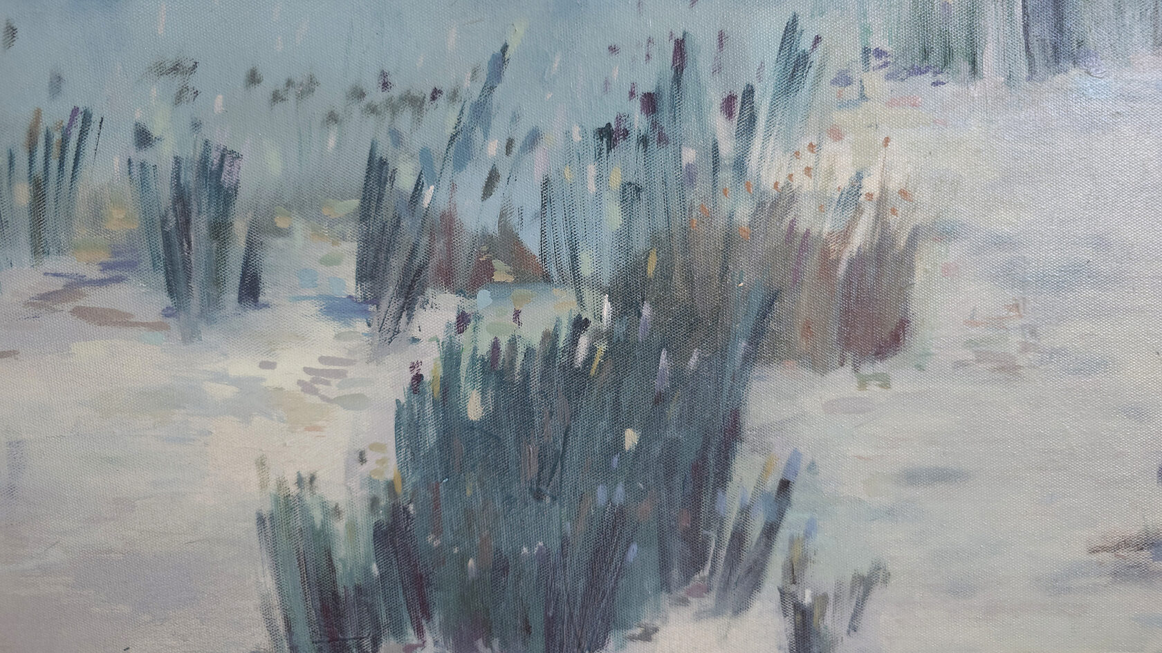 Картина написана в авторской технике, вдохновлена природой в момент перехода осени в зиму, на льняном холсте, на галерейном подрамнике 3.5 см, подписана автором с фронтальной и обратной стороны холста. Крепеж в комплекте, торцы окрашены.