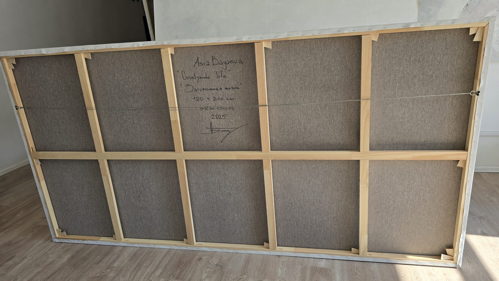 120 х 240 x 3.5 см холст / масло Абстрактный пейзаж сельской местности, неспешное течение времени. Отдыхая на природе в детстве я часть наблюдала как один и тот же вид меняется с движением солнечного света, как он отличается при свете утра и на закате дня. Эта картина - воспоминание о счастливом детстве ! Работа выполнена на холсте в 2025г., на галерейном подрамнике, подписана автором с фронтальной и обратной стороны холста. Крепеж в комплекте, торцы окрашены.