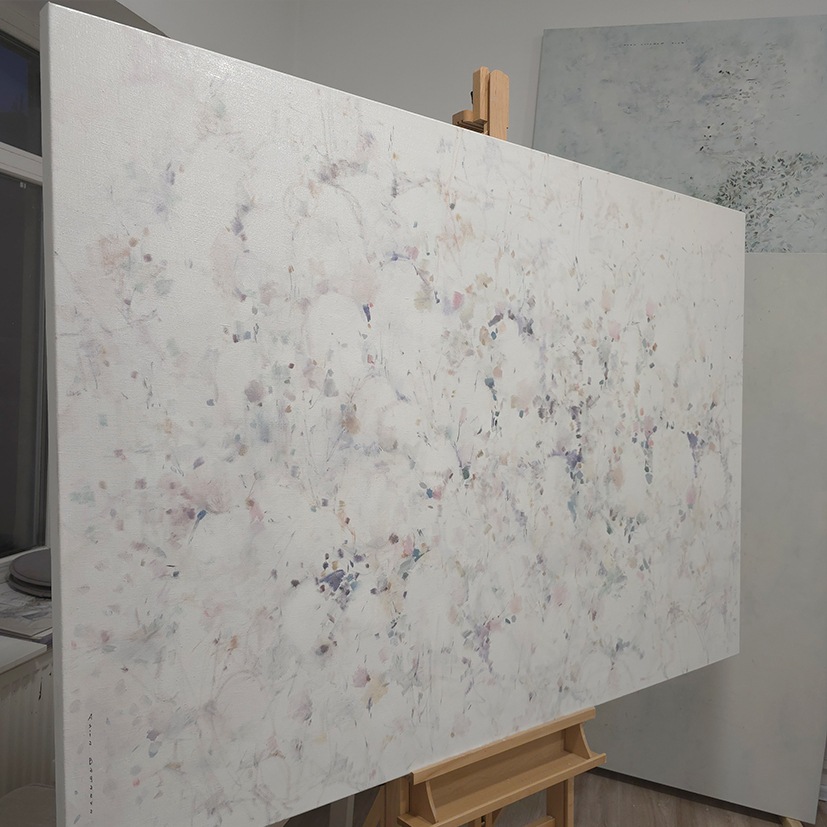 100 х 150 x 3.5 см холст / масло Живописная абстрактная композиция выполнена в технике имитации акварели для придания легкости. Японский сад летом озаряет садящееся солнце. Нежность растительных мотивов, цветение в саду подчеркнуты тонкими переходами. Работа выполнена на галерейном подрамнике толщиной 3.5 см и на 100% льняном холсте. 2024 г. Подписана автором с фронтальной и обратной стороны холста.