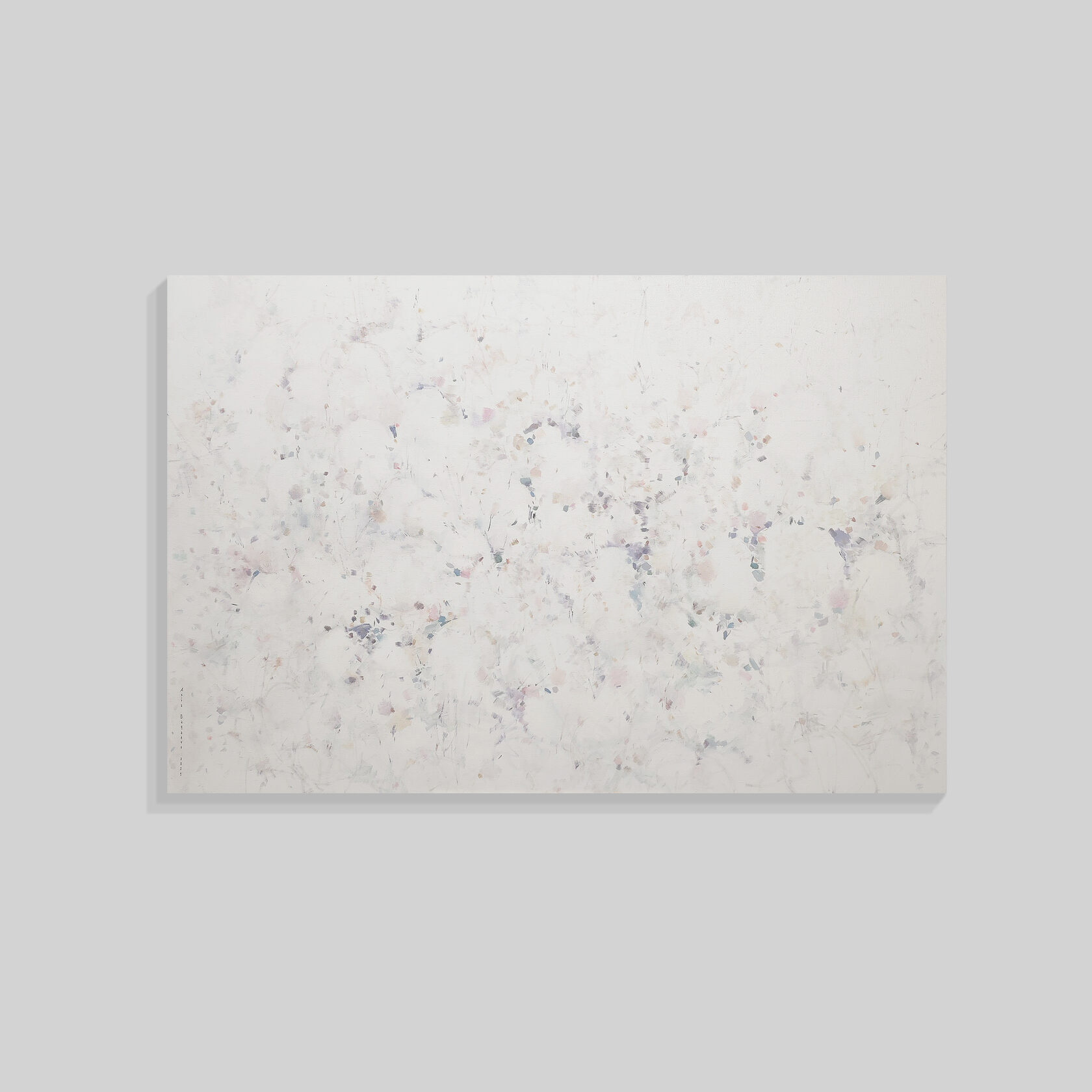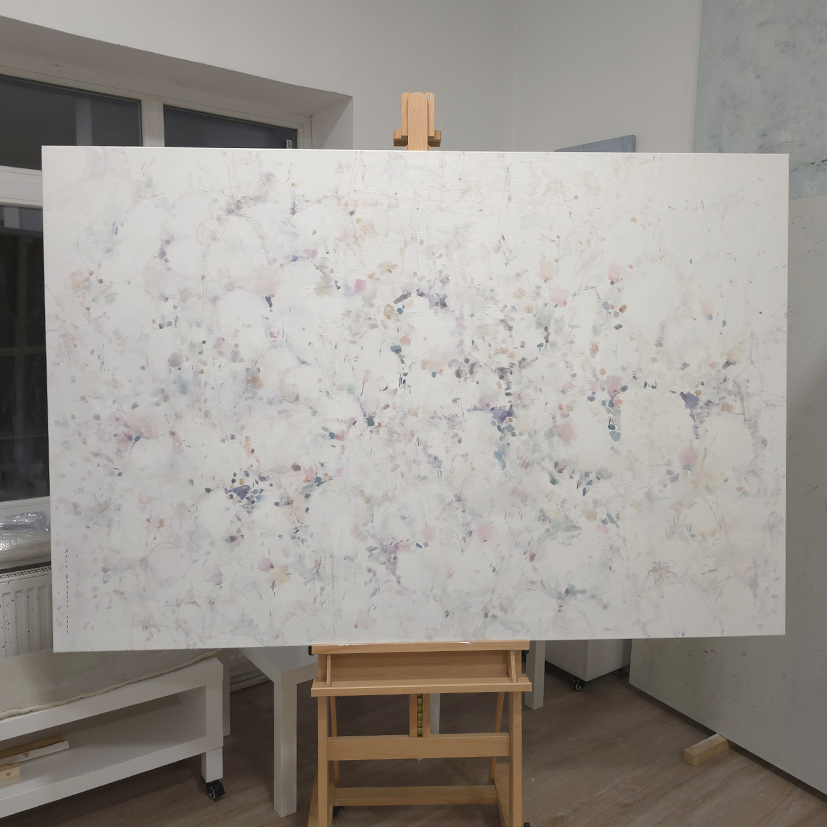 120 х 90 x 3.5 см холст / масло Абстрактный пейзаж 2025 г., выполнен в нежных оттенках, на фоне поле с очертаниями деревни, на переднем плане устремляющиеся ввысь растения и травинки. Работа выполнена на галерейном подрамнике, на холсте, подписана автором с фронтальной и обратной стороны холста. Крепеж в комплекте.
