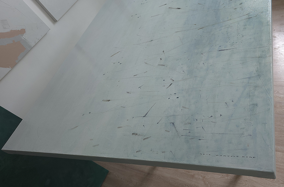 100 х 100 x 3.5 см холст / масло Абстрактная композиция, 2022 г. Триптих, часть 3— каждая часть 100х100 см выполнен на галерейных подрамниках, маслом на 100% льняном холсте, 2022 г.